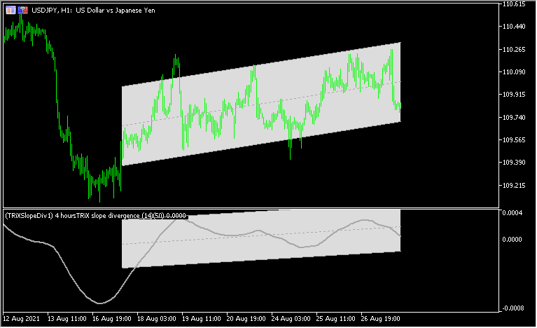 下のチャートは1時間足に4時間足のtrix-slope-divergence-mtf-indicatorを表示しています。