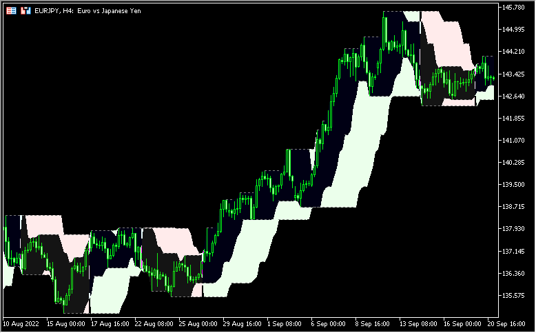 ハイローバンドに挟まれた価格帯が塗りつぶされて、一目均衡の雲のような見た目になっています。