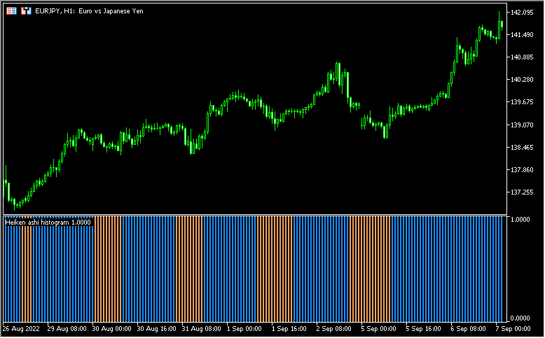 平均足MAの向きをチャート下のバーの色で示すインジです。