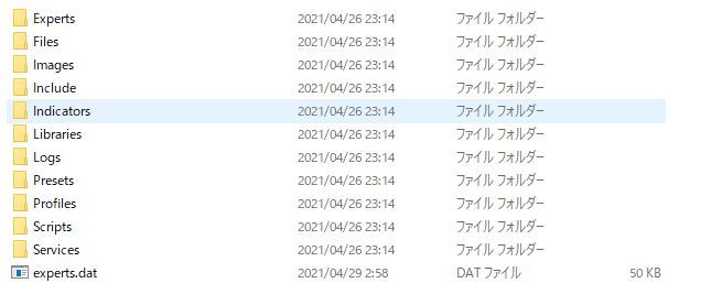 1. データフォルダを開く⇒MQL5を開く⇒Indicatorsを開く