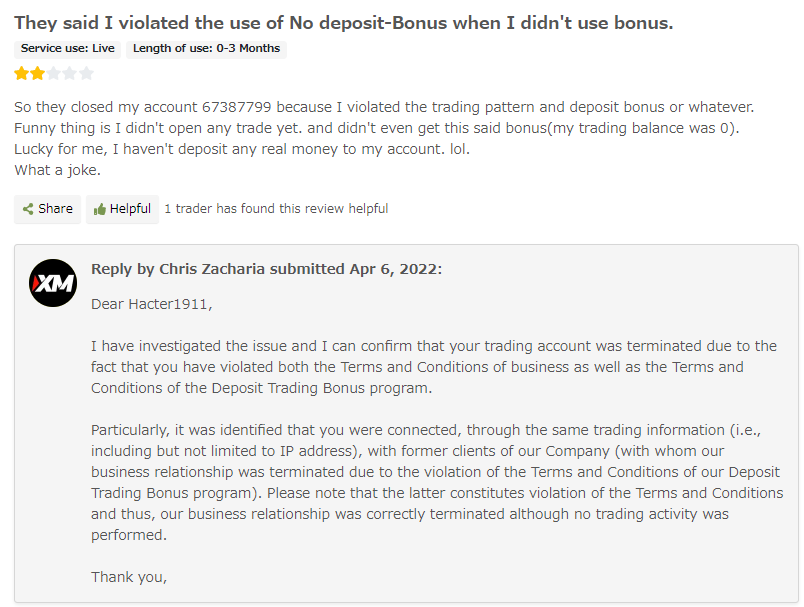 これは、以前規約違反を犯した利用者が、再度口座開設をしたものの、XM側に弾かれてしまったために怒り狂って書いたレビューなのでしょう。