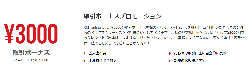 XMでは、新規口座開設者を対象に、3000円分の取引ボーナスがもらえます。