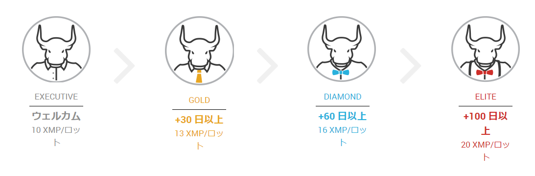 更には、ロイヤリティプログラムと言うものがあり、取引ロット数に応じてXMPを受け取れます。XMPはボーナスに変えたり、現金に変えることができます。
