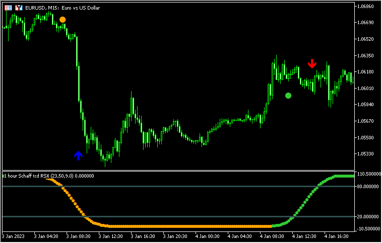 下のチャートでは15分足チャートに4時間足のSchaff tcd RSX (mtf + arrows)を表示しています。