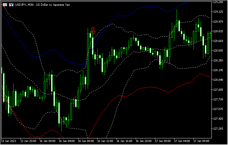 下のチャートは同じ設定のボリバンとエンベロープを表示したものです。