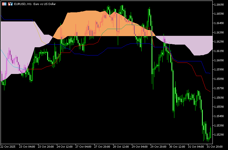 下のチャートは1時間足チャートに4時間足の一目均衡表を表示しています。