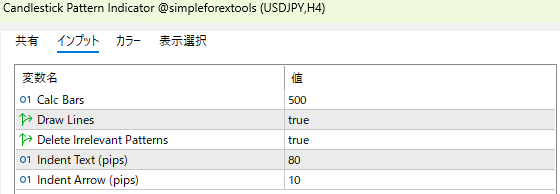 このインジ一つで複数のパターンを認識し、更にはどのパターンなのかをサインと一緒に表示するため、特定のパターンのエントリーやパターンの勉強をする際に役立ちます。