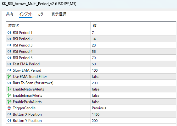デフォルトでは2本のMAとRSIのサインに関係性はありませんが、設定内の「filter」をtrueにすると、2本のMAがゴールデンクロス中は買いサインのみ、デッドクロス中は売りサインのみが出るようになります。