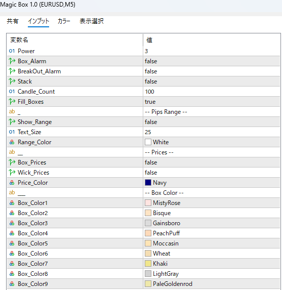 横ばいの動きが何本出たらボックスとして認識するかは設定内のpowerで変更可能です。
